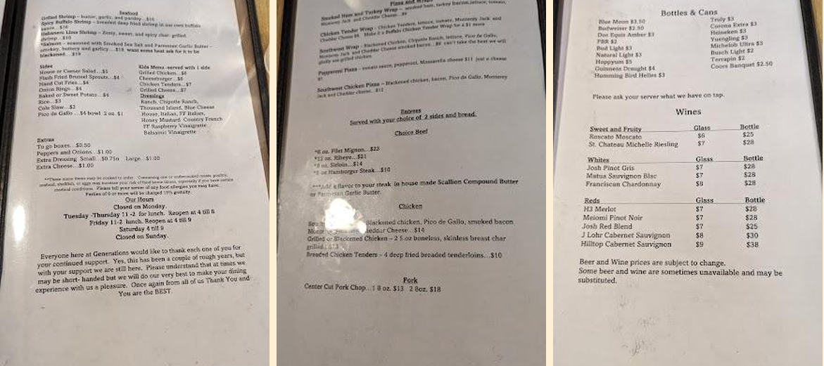 Generations gives diners a relaxed scene, perfect for any meal. The local specialties receive praise for their flavor. Many love the quick service and the generous portions. A wide beer and wine selection keeps guests happy. Friendly staff create a welcoming environment.